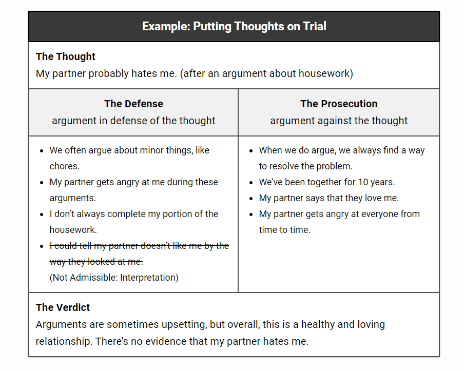 In each of these situations, the person’s thoughts weren’t necessarily based on facts—they were distorted interpretations. Those thoughts quickly shaped their emotions, which then drove their actions. This is something we all do. When we are cruising through our day, we often have trouble identifying when our thoughts are distorted because they feel so accurate in the moment. When our interpretations are distorted, they create unnecessary emotional pain and unhelpful behavior reactions. But, what if we could get better at catching those distortions before they take over? That’s where a tool called “Thoughts on Trial,” comes in. In the next section, we’ll break down how it works and how you can use it to challenge distorted thoughts and bring more balance to your emotional life.